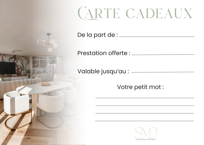 Offrez une carte cadeau de décoration d’intérieur en sélectionnant un montant ou la prestation de votre choix ( visualisation 3D, moodbard, conseil déco ou projet clé en main....).